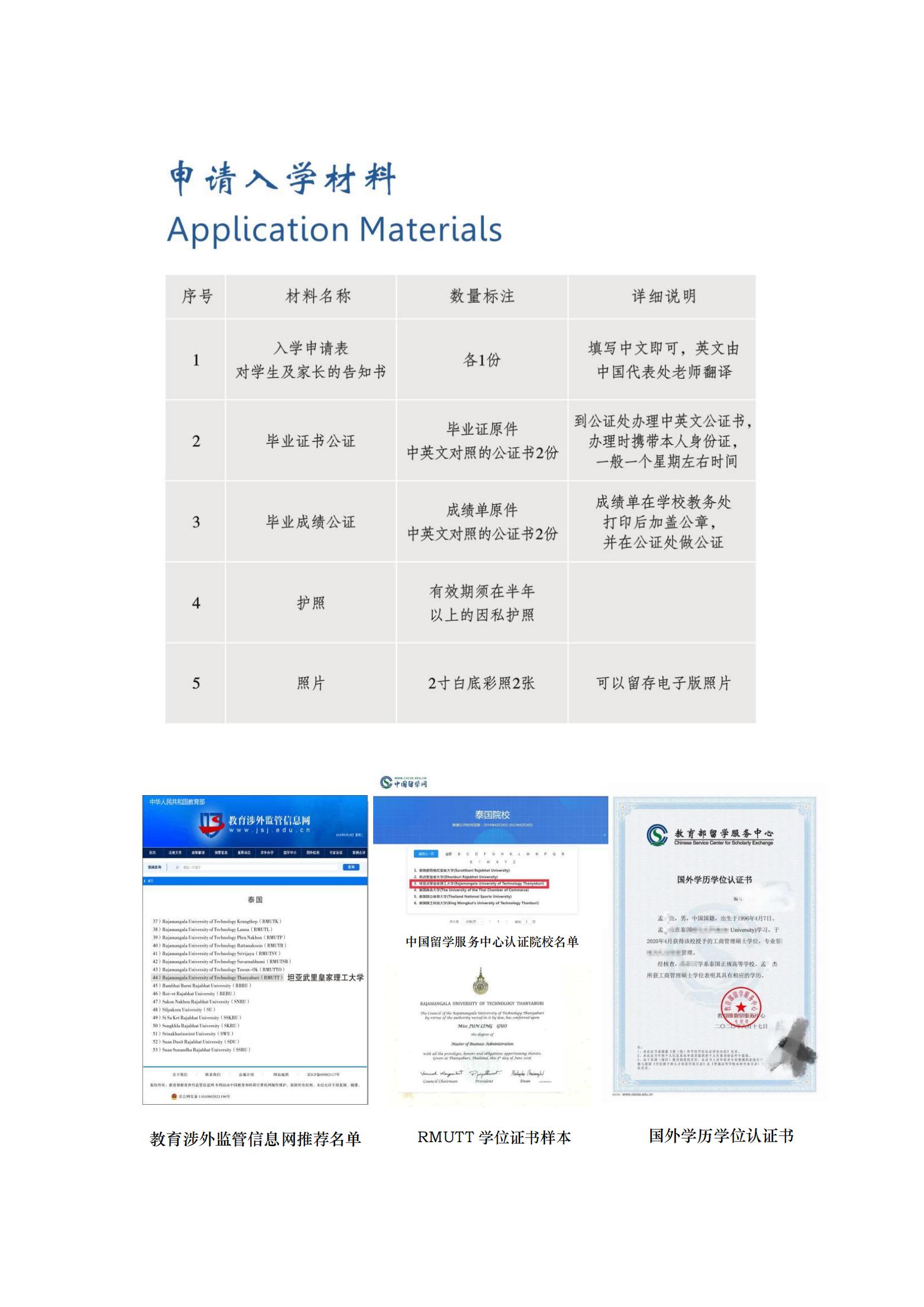 錄取要求:達到中國各省當年本科線的學生免試入學,未達到者須參加泰國坦亞武里皇家理工大學(RMUTT)自主招生選拔考試。