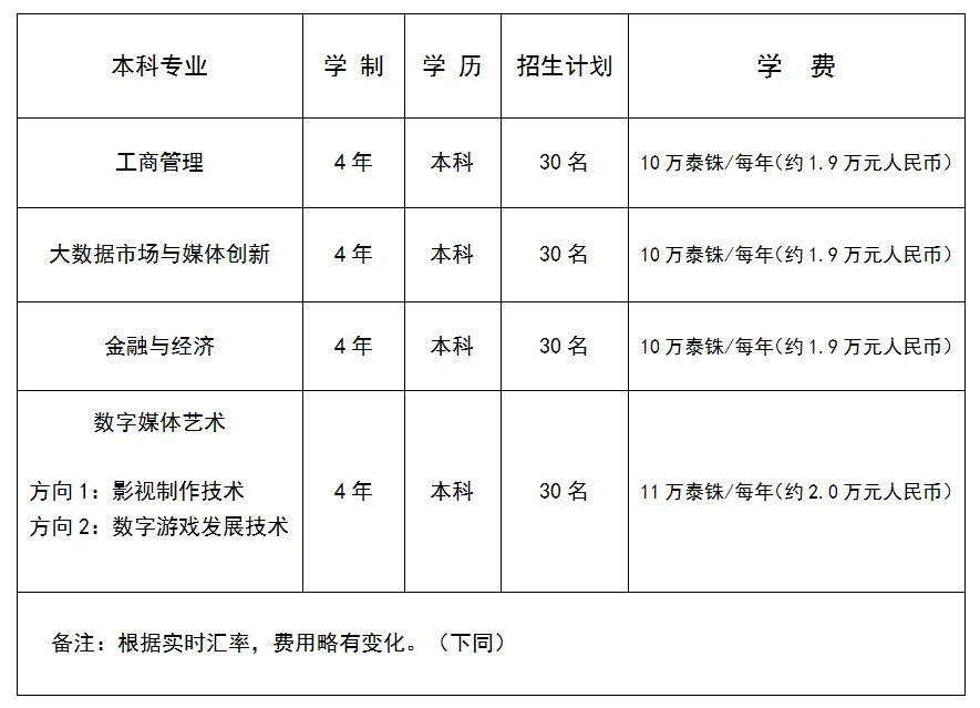 學制與學位:學制四年,畢業(yè)后由泰國坦亞武里皇家理工大學頒發(fā)學士學位。